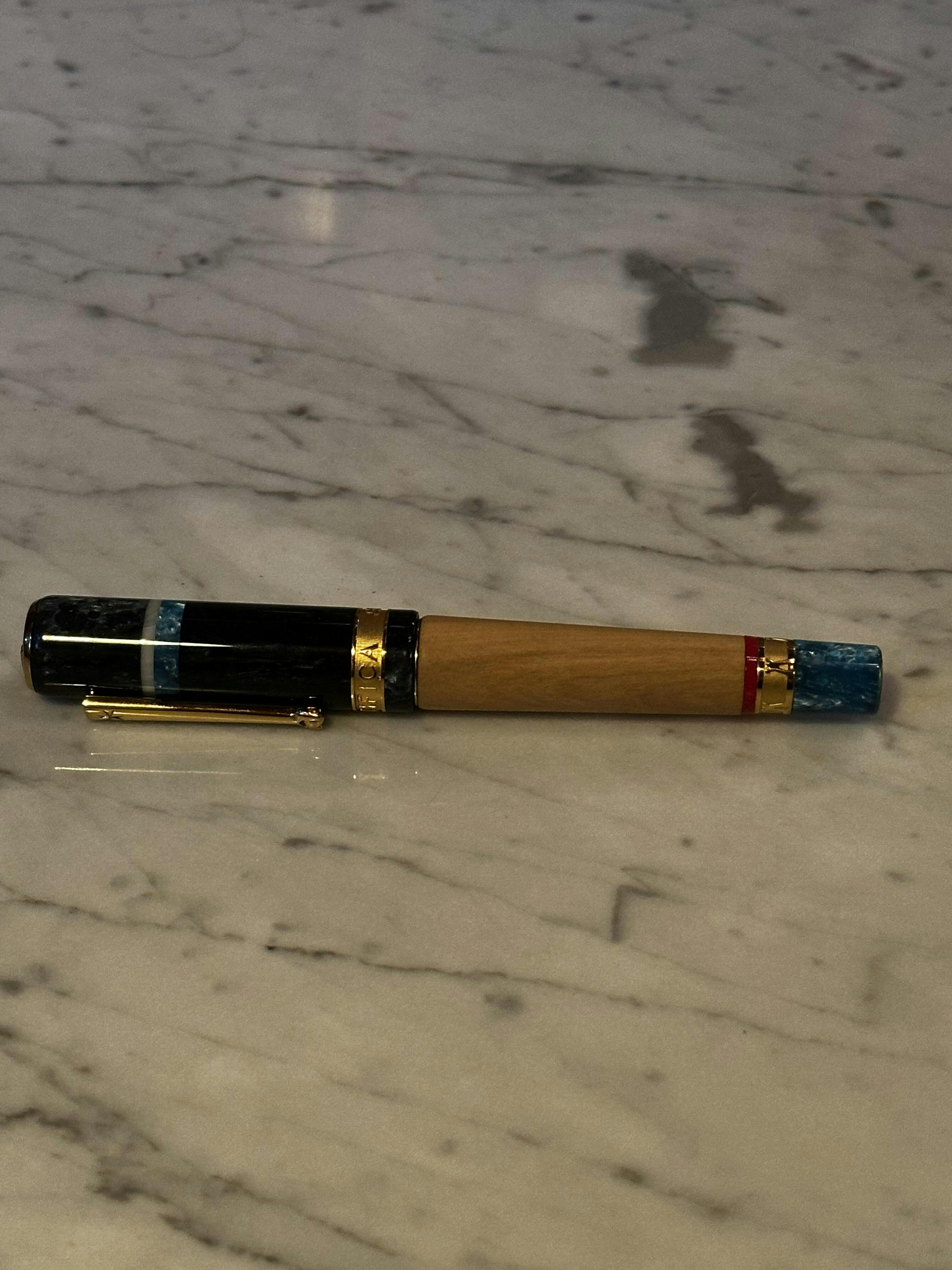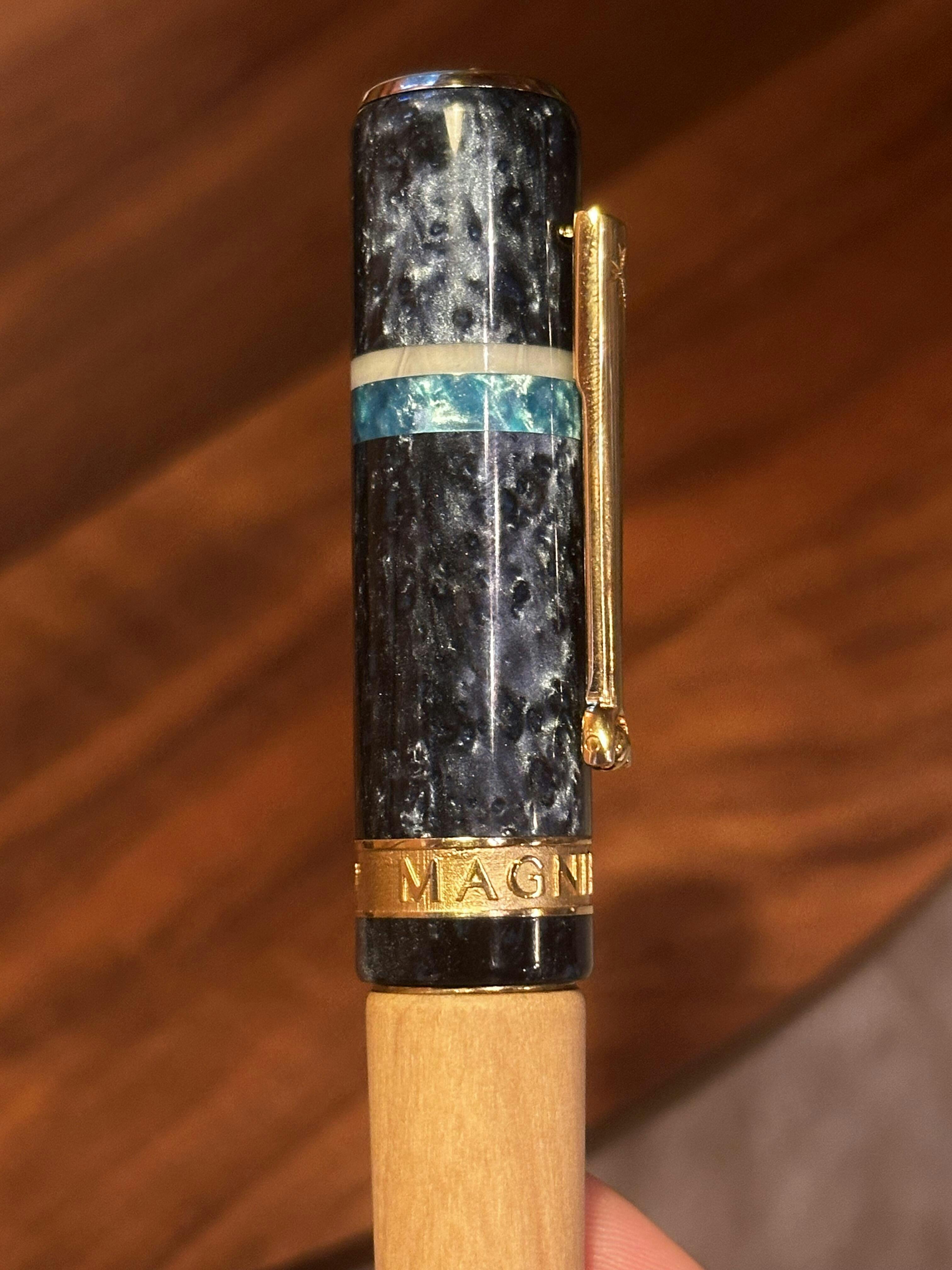 A Maltese cross, also known as an Amalfi cross, is engraved into the clip. A compass made famous by Italian mariner Flavio Gioia enriches the end of the barrel while a medallion with the crest of the Citta di Amalfi Antica Republica Marinara sits atop the cap.