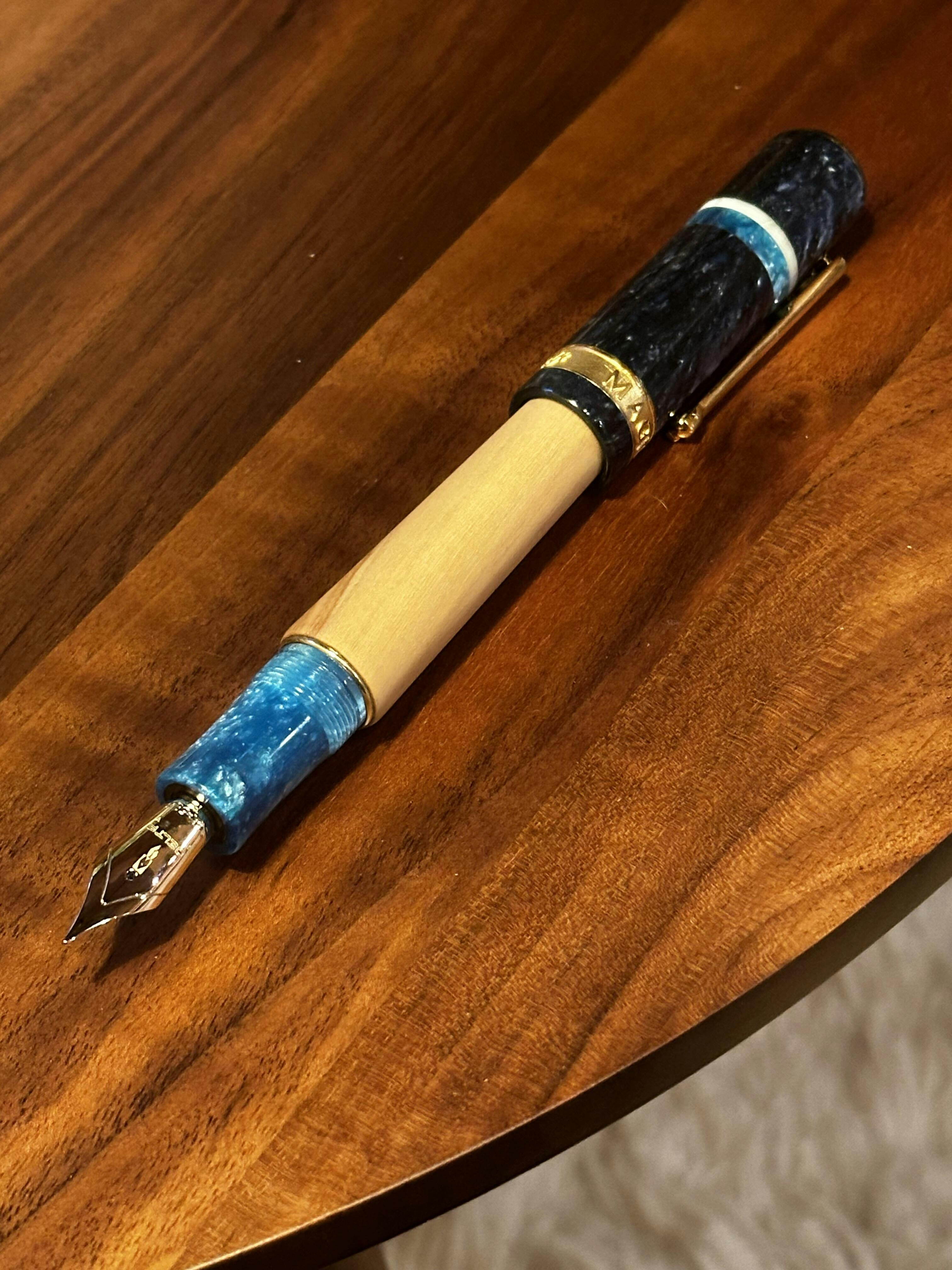 The fountain pen is refillable using standard international ink cartridges or using the included converter with bottled ink. It is completed with a #6 yellow gold 14k nib made by JoWo.